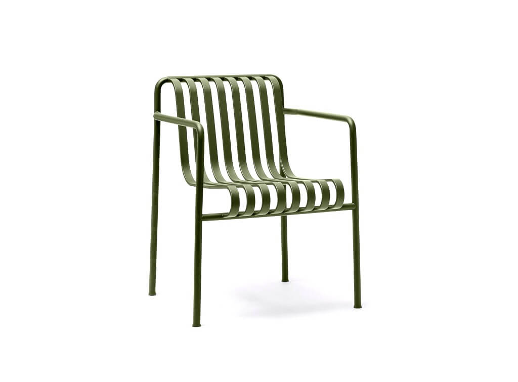 Minimalistinė , išskirtinė, metalinė lauko ar vidaus kėdė su porankiais pietų stalui. Labai panaši į skandinavų Palissade gaminį.