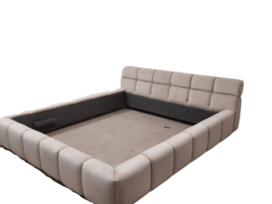Lietuvių gamintojų miegamojo lova išskirtiniu galvūgaliu.