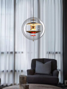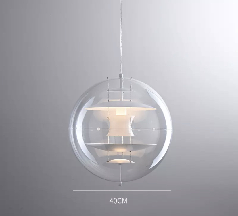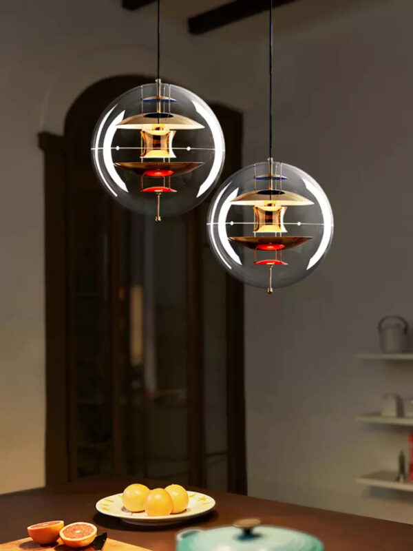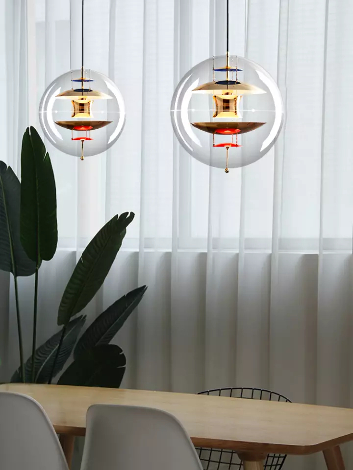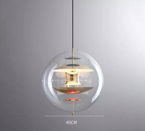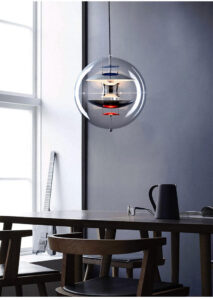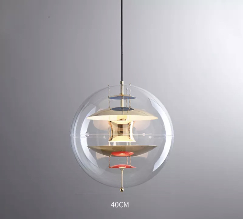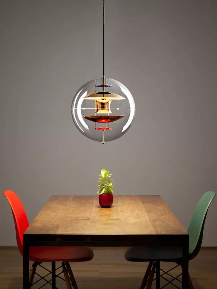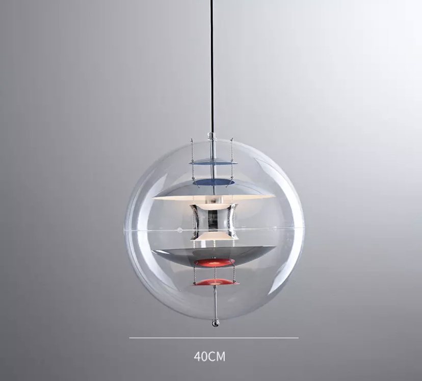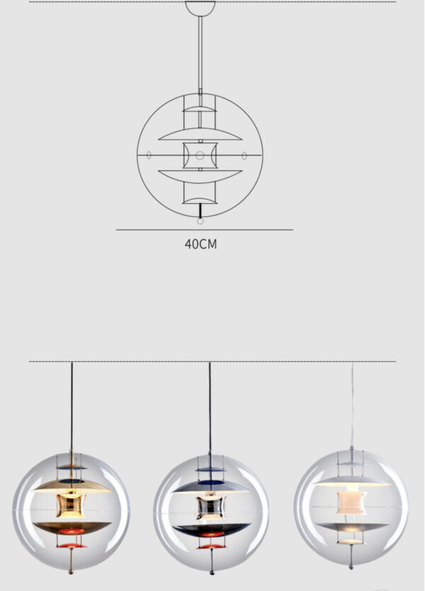 Futuristinio stiliaus pakabinamas šviestuvas. Panaši į 1969 m. sukurtą šviestuvo modelį Verpan.