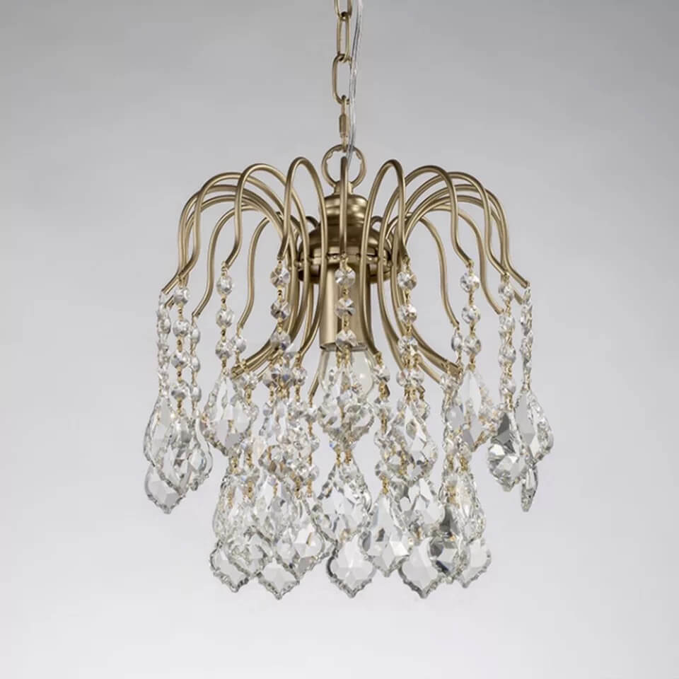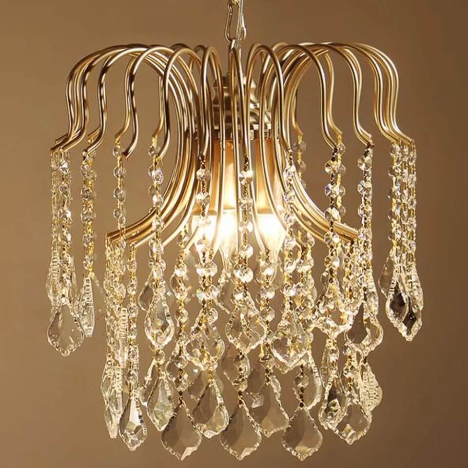 Modernaus stiliaus, elegantiškas aukso spalvos, stiklo kristalų pakabinamas šviestuvas.