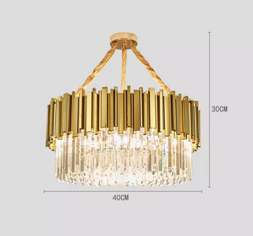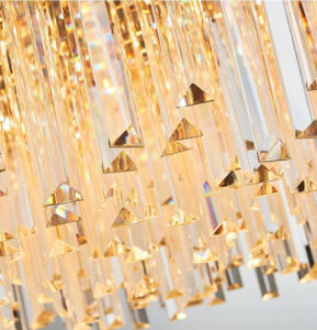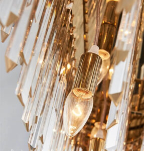 Prabangus, elegantiškas aukso spalvos pakabinams šviestuvas.