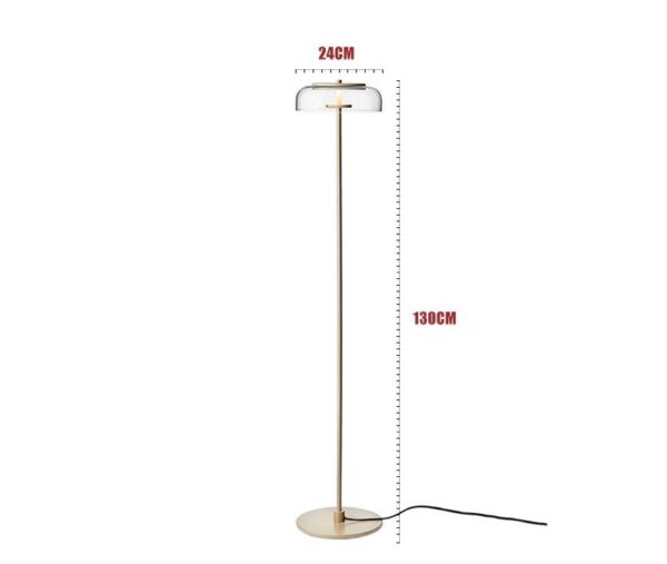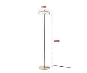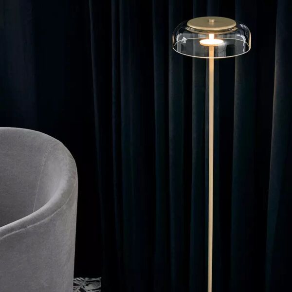 Postmodernus pastatomas šviestuvas. Apvalus stiklinis lempos gaubtas, panašus į Blossi pastatomą šviestuvą.